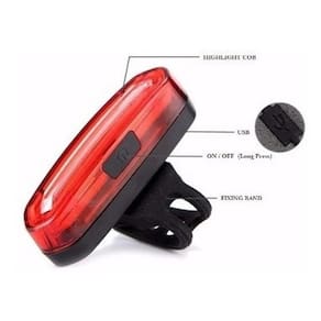 Feita com materiais plásticos de alta qualidade, esta lanterna traseira LED é resistente a chuva e recarregável via USB.