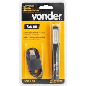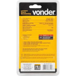 Especificações Modelo: LCR 150 Material: Plástico e borracha Cor: Preta Comprimento total: 128 mm Diâmetro da lente: 10 mm Tipo de lâmpada: LED Fluxo luminoso: LED frontal: 150 lm / LED lateral: 100 lm Alimentação: 1 Bateria 3,7 V - 350 mAh recarregável Duração aproximada da bateria: 2 horas e 50 minutos Índice de proteção: IP20 Tensão de carregamento: 5 V DC / 1 A (cabo USB) Tempo de carga: 2 horas e 30 minutos Índice de proteção contra impactos: IK07 Massa aproximada: 0,1 kg Itens Inclusos Lanterna LED Recarregável Vonder LCR150 1 Cabo USB tipo C Perguntas Frequentes (FAQ) Pergunta: Qual o tipo de bateria utilizada?