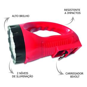 Garantia: 90 dias pelo direito legal do consumidor Bateria: Longa duração 4V selada, recarregável 127/220V – 50/60Hz Carregador: Embutido Tempo de Recarga: 8~10 horas Tempo de Duração da Recarga: 6~8 horas Leds: 1 Alcance: Longo Cor da luz: BrancaCor do Produto: Vermelho