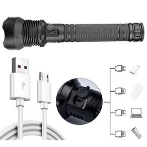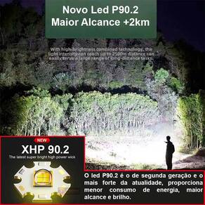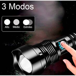 Especificações Técnicas Alcance aproximado: até 2000 metros (valor de referência) Lente: Angular com zoom ajustável Modos de iluminação: 3 (50%, 100% e SOS) Temperatura de cor: Branco frio Material: Alumínio anticorrosivo Alimentação: 2 baterias 26650 ou 2 baterias 18650 (inclusas) Tipo de carregamento: Micro USB Resistente à água (não submergir) Vida útil estimada do LED: até 100.000 horas