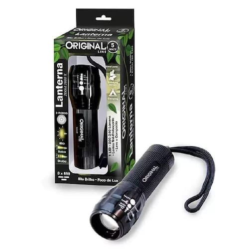 Com uma potência de 200-240 lúmens, esta lanterna utiliza três pilhas AAA e possui um LED Q5 de longa duração, com vida útil de até 100.000 horas, garantindo uma iluminação confiável por muito tempo. É importante mencionar que ela é protegida apenas contra pingos e jatos leves de água, portanto, não é indicada para mergulhos ou atividades aquáticas mais intensas.