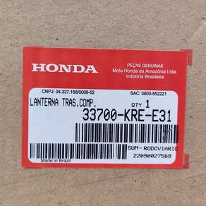 Marca: Honda. Garantia: 90 dias. Data: 27/08/2025. Conteúdo da Embalagem: 1 UND de Lanterna Traseira. Dimensões em cm (Altura x Comprimento x Largura): 8.0 x 12.0 x 10.0. Peso (kg): 0.5. Código SKU: RMDI20200866. Código do Fabricante/Referência: 33700-KREE-31. NCM: 8512.40.10. Descrição NCM: Lanternas traseiras automotivas.