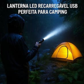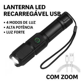 Lanterna LED Recarregável USB Portátil - Potência e Resistência em Suas Mãos Seja para camping, pesca noturna, caminhadas, uso doméstico ou situações de emergência, esta Lanterna LED Recarregável garante iluminação potente, durabilidade e praticidade. Com 4 modos de iluminação, foco ajustável e corpo super resistente, você estará sempre preparado para qualquer situação. Características principais: Super Potente - Brilho de até 1200 lúmens, iluminando até 500 metros de distância. 4 modos de luz - Alta, baixa, estroboscópica e SOS. Zoom telescópico - Ajuste o foco para iluminar grandes áreas ou pontos específicos. Recarregável via USB - Bateria interna de lítio, carregamento rápido e prático. À prova dágua - Use em dias de chuva sem preocupações. Alta resistência - Construção em ABS de alta durabilidade, resistente a impactos e anticorrosão. Compacta e portátil - Apenas 14,4 cm de comprimento, cabe no bolso, mochila ou kit de emergência. Tempo de uso - Até 15 horas no modo econômico com carga completa. Conteúdo da Embalagem: 1x Lanterna LED Recarregável 1x Cabo USB para carregamento 1x Cinta elástica ajustável Especificações Técnicas: Cor da lanterna: Preto Cor da luz: Branco Potência: 1200 lm Alcance: até 500 m visibilidade noturna impressionante Modos de iluminação: 4 Alta, Baixa, Estroboscópio, SOS Material: ABS de alta resistência Alimentação: Bateria interna de lítio 18650 inclusa Carregamento: USB 5V - compatível com carregadores de celular, PCs e power banks Dimensões: 14,4 cm x 3,3 cm Dúvidas Frequentes: Preciso remover a bateria para recarregar Não Basta conectar o cabo USB diretamente na lanterna. Funciona em tomadas 220V Sim Compatível com 127V e 220V através de carregadores de celular 5V . Qual a vida útil da lâmpada LED Mais de 100.000 horas de uso, sem precisar trocar. Posso usar em dias de chuva Sim, ela é à prova dágua e resistente a condições climáticas adversas. Por que escolher esta lanterna Iluminação profissional em qualquer situação Resistência máxima para ambientes extremos Bateria recarregável de longa duração Funciona até em dias chuvosos Adquira agora sua Lanterna LED Recarregável USB Ilumine seu caminho com segurança e confiança