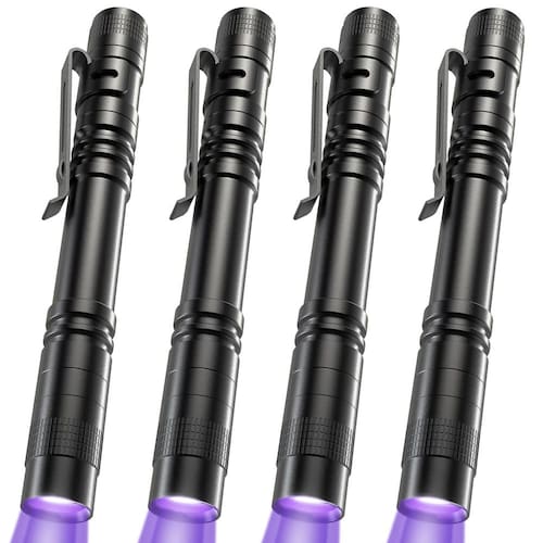 - ??Garantia de qualidade?Você receberá 4 lanternas de luz negra, cada lanterna alimentada por 2 pilhas AAA (não incluídas), material de alumínio de grau militar e o design portátil tornam nossa luz negra a escolha perfeita de presente para familiares, amigos e amantes de animais de estimação. Garantia de devolução do dinheiro em 90 dias.