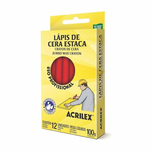 Lápis De Cera Estaca Vermelho Fogo Acrilex 507 Para Marcação de Madeira, Couro, Borracha, Cimento, Mármore e Granito . Não Tóxico, Não Mancha As Mãos, Frágil, Evite Quedas e Choques. Contém: 12 Unidades De Cor Unica. Composição: Ceras Cargas Minerais, Inertes E Pigmentos. Medida Aproximadamente: Comprimento: 7 cm Largura: 2,5 cm Altura: 13,5 cm INMETRO: REGISTRO 000239/2014 OCP0098 Ean: 7891153091273