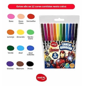 Tinta super lavável à base de água Ponta fina de 2,2 mm firme, resistente e bloqueada Tampa ventilada anti-asfixiante. Não Tóxica Cores vivas e densas Corpo redondo Grande durabilidade Disponível em 12 cores.