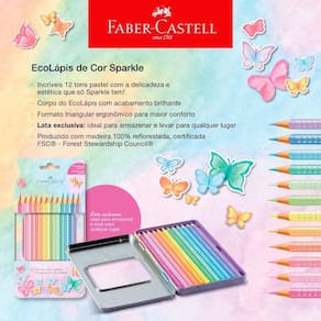 A família Sparkle acaba de ficar maior! Chegou o novo Ecolápis de Cor Sparkle em uma lata exclusiva para deixar seu material mais bonito e brilhante. São 12 incríveis cores pastel com a delicadeza e estética que só Sparkle tem! Ideal para organização e levar para qualquer lugar. Formato triangular ergonômico para maior conforto, corpo com acabamento brilhante e produzido com madeira 100% reflorestada, certificada FSC - Forest Stewardship Council.