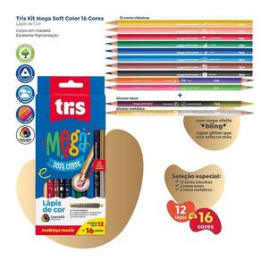 Lápis de Cor Tris Mega Soft 12 Cores + Tons Neon e Metálicos Lápis mega soft color Tris qualidade para potencializar a sua criatividade: Cores clássicas e especiais em um só estojo Descubra 12 lápis com 16 cores, incluindo tons neon e metálicos. Os lápis de tons especiais possuem corpo com efeito bling super glitter que não solta na mão .