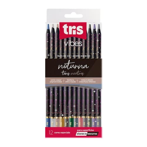 Lápis de Cor Tris Vibes 12 Cores Noturna Tons Neutros A linha Lápis de Cor Noturna Vibes da Tris é perfeita para quem quer explorar novas combinações de cores e se aprofundar no mundo das artes. Com cores super pigmentadas, tons neutros, mina de 4.0mm garantindo traços consistentes. Textura ultra macia e cobertura intensa, esses lápis possuem design moderno com corpo redondo e estampas holográficas.