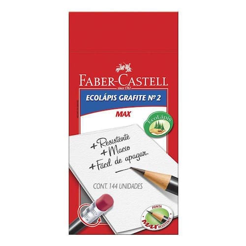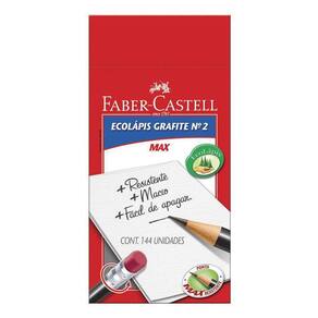 Lápis Grafite Faber-Castell 1205 Max N2 Com Borracha 144 Un 1205M/B 01850O Ecolápis Grafite Faber-Castell Max Preto possui formato redondo e está disponível nas versões com e sem borracha. Além disso, sua ponta é max resistente, o que proporciona maior durabilidade ao produto e mais facilidade ao apontar. A graduação é Nº2B, ideal para escrita em geral. Produzido com madeira 100% reflorestada e certificada pelo FSC: respeito ao meio ambiente. Produto atóxico e não perecível. Ponta max resistenteGraduação nº2B: ideal para escrita em geralProduto contém: Caixa com 144 UnidadesAtenção Não recomendável para crianças de até 3 (três) anos, por conter parte(s) pequena(s) que pode(m) ser engolida(s) ou aspirada(s).