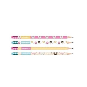 o lápis grafite hb donuts possui grafite com mina de 2,2mm, virola e borracha colorida, 4 estampas temáticas, formato redondo. Ponta resistente; possui borracha acoplada; tamanho aproximado: 0,7cm x 18,5 cm; composição: resinas e pigmentos. Atóxico. Indicada para crianças maiores de 4 anos. .