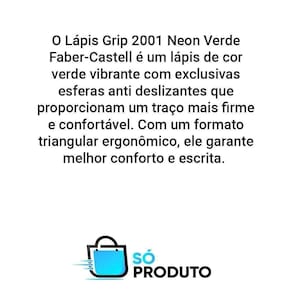 O lápis grip 2001 neon verde faber-castell é um lápis de cor verde vibrante com exclusivas anti deslizantes que proporcionam um traço mais firme e confortável. Com um formato triangular ergonômico, ele garante melhor conforto e escrita. O grafite preto do lápis é forte e preciso, permitindo uma escrita limpa e nítida. Feito em madeira macia e totalmente ecológico, o lápis é resistente e fácil de apagar. Além disso, as antideslizantes no corpo do lápis evitam que ele escorregue da mão, proporcionando uma experiência mais segura e agradável ao escrever. Em resumo, o lápis grip 2001 neon verde faber-castell é uma ótima opção para quem busca um lápis de qualidade e com um design moderno e ergonômico. As imagens são meramente ilustrativas