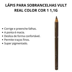 Lápis para Sobrancelhas Cor 1Lápis para Sobrancelha Vult corrige falhas, preenche e define o delineado de forma sutil e com cores naturais. A ponta macia de Lápis para Sobrancelha Vult desliza de forma confortável sobre a pele e permite com que você reproduza finos traços que imitem os pelos da sobrancelha. Assim, permite com que suas sobrancelhas ficarem preenchidas, livres das falhas e imperfeições, além de emoldurar o olhar com charme e personalidade..Modo de usarDesenhe traços finos nas regiões da sobrancelha que estejam com falhas de forma a reproduzir os fios naturais até que o desenho fique mais preenchido..ResultadoSobrancelha perfeita de forma natural, discreta e fácil.
