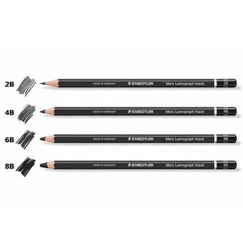 Lápis Graduado Staedtler Lumograph. Confira todas as graduações e lápis de variados tipos. Lápis Staedtler Lumograph Black - 2B Lápis de qualidade superior com elevada proporção de carvão para resultados de pretos intensos e mates. São 4 graduações diferentes, especialmente adequadas para desenhar e sombrear, bem como ára esboços e retratos expressivos. Complementado por Mars Lumograph para resultados com brilho metálico, em uma variação de tonalidades cinzas.