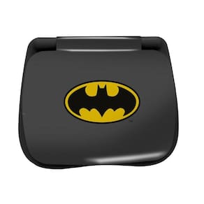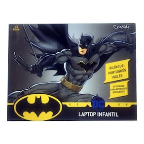 Laptop infantil bilíngue (português/inglês) com diferentes grupos de atividades, sendo eles: música, letras, palavras, ortografia, perguntas e respostas, soma e divisão. Com o laptop do Batman as criança aprendem brincando. Utiliza 3 pilhas AA não inclusas.