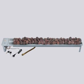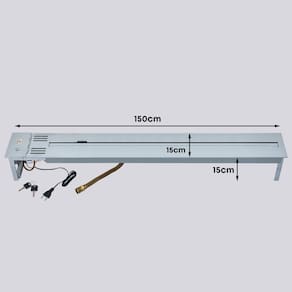 Tamanho: 150 cm (c) x 15 cm (a) x 15 cm (l); Queimador linear: 127 cm | 1 linha de fogo; Área de aquecimento: 100 m² - Considerando pé direito de até 2.80m; Consumo de gás: 720 g/h; Peso: 16 kg; Acabamento: cinza fosco | tinta especial para altas temperaturas; Material: aço carbono; Acendimento: manual com faísca elétrica (igual a um forno a gás); Dispositivo de Segurança: Termopar – Sistema que corta o gás na ausência do fogo, semelhante a um forno a gás; Segurança extra para crianças: Chave na tampa da caixa de acionamento; Voltagem: bivolt;