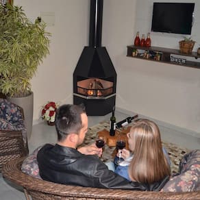 Lareira De Canto Grande S/cx C/ Kit De Inst. Preto A Lareira da Fornos Pinhal é perfeita para sua casa ou sala comercial. Seu funcionamento deixa a casa quentinha e aconchegante. Além de ser uma ótima fonte de climatização, a lareira também é uma ótima decoração para qualquer ambiente. Suas chamas dançantes são um verdadeiro espetáculo à parte, que vai deixar qualquer pessoa encantada. Características Acabamento tinta alta temperatura 250C; Base e laterais revestidos com tijolos refratários; Tela de proteção contra brasa; 01 mexedor de brasa; 01 chapéu; 3 metros de cano; Borda em aço inox; Regulagem da saída de fumaça;