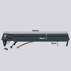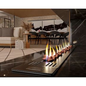 Tamanho: 120 cm (c) x 15 cm (a) x 15 cm (l); Queimador linear: 97 cm | 1 linha de fogo; Área de aquecimento: 80 m² - Considerando pé direito de até 2.80m; Consumo de gás: 576 g/h; Peso: 14 kg; Acabamento: preto fosco com leve textura | tinta especial para altas temperaturas; Material: aço carbono; Acendimento: manual com faísca elétrica (igual a um forno a gás); Dispositivo de Segurança: Termopar – Sistema que corta o gás na ausência do fogo, semelhante a um forno a gás; Voltagem: bivolt; Ambiente para uso: interno - protegido do sol e intempéries; Regulagem de chama: 5 níveis de altura; Pedras vulcânicas inclusas para decoração; Instalação: Uso embutido (semelhante a um cooktop); Chaminé: Recomendado somente quando o tamanho da lareira não estiver de acordo com tamanho do ambiente ; Cheiro: Toda lareira a gás, a álcool ou a lenha possui chama real e por consequência um cheiro característico. A lareira a gás quando instalada corretamente, ao ser acesa irá gerar um cheiro leve que não irá incomodar; Pressão de gás: Baixa pressão 2kg; Tubulação de gás: Mínimo de ½” (polegada), deixar rosca macho no interior do nicho; Nicho: Instalar em granito ou alvenaria, caso utilize mármore, consulte o seu marmorista para a escolha da pedra ser resistente ao calor. NUNCA utilize MDF e não recomendamos madeira mesmo de lei ou dormente. A chama da lareira é real. Acima da lareira deve ter uma área livre de no mínimo 60cm de altura para ventilação; Manual: Fale com um especialista e receba o manual completo de instalação. Nos envie seu projeto para receber atendimento personalizado e prevenir imprevistos;