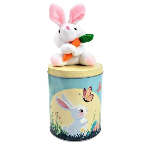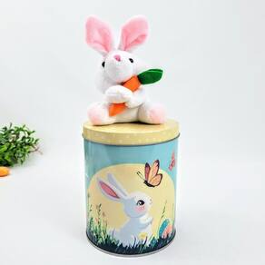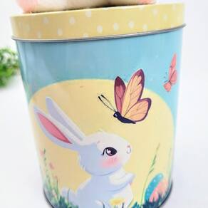 design Encantador: A lata é decorada com um charmoso coelho no topo, ideal para presentear ou decorar sua casa nesta Páscoa.