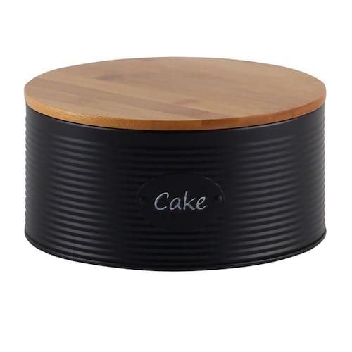 Lata redonda em metal com pintura preta acetinada por dentro e por fora, com as palavra CAKE (significado em português: BOLO) brancas em tag de metal preto arrebitado na lata, tampas em madeira de encaixe com vedação de silicone..