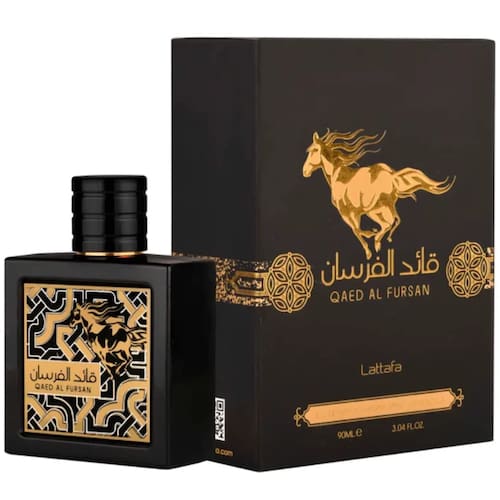 Qaed Al Fursan Lattafa Eau de Parfum Apresentando Qaed Al Fursan Eau de Parfum de Lattafa. Um perfume expressivo e elegante, com matérias-primas excepcionais. Um convite à plenitude. A fragrância abre com uma mistura cativante de Abacaxi e Açafrão, antes de revelar um coração refinado de Jasmim e Bálsamo de Abeto. Por fim, uma combinação preciosa de Âmbar, Cedro e Agarwood (Oud).