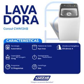 Lav. 13 Kg Consul - Cwn13abana . Cor: BRANCO - Voltagem: 110 VOLTS DESCRIÇÃO Máquina de Lavar Consul 13 kg Branca com Modo Eco As novas Lavadoras Consul têm vários tipos de ciclos, lavando desde tênis, roupas de cama até rede e edredom, sem ocupar espaço. O painel é intuitivo fácil de programar, conta com funções que economizam e deixam as roupas mais secas e menos tempo no varal. DESCRIÇÃO TÉCNICA Modelo: CWN13AB Capacidade: 13kg Abertura: Superior Método de preparo: 12 Painel de controle: Digital Ã&129;gua quente: Não Pluge e tomada: 10A Programas de lavagem: 12 Painel de controle: Digital Ciclos de lavagem: Dia a Dia, Delicadas, Esportivas, Tênis, Jeans e Casacos, Rápido, Panos de Limpeza, Reusar Ã&128;gua, Redes, Cama e Banho, Edredom, Brancas, Função ciclo rápido: Sim Níveis de água: 4 Ã&129;gua quente: Não Esterelização: Não Desligamento automático: Sim Reutilização de água: Sim Pré-lavagem: Não Molho: Sim Seleção por tipo de roupa: Sim Trava de segurança: Não Diluição anti-mancha: Não Função tira manchas: Não Função elimina fiapos: Sim Função nível de sujeira: Sim Agitação delicada: Não Função autolimpeza: Não Função turbo lavagem: Não Lava edrodon: Sim Classificação energética: A Modo Eco: Sim Economia em dobro é o que você procura Com o Modo Eco você economiza até 15%1 de água e até 25%2 de energia elétrica. É só escolher qualquer ciclo, selecionar essa opção e pronto Modo Mais Secas: Sim Função que prepara suas roupas para ficarem menos tempo3 no varal, facilitando sua vida nos dias mais frios. Ciclo Rápido: Sim Roupas poucos sujas ficam limpas em 18 minutos6 e está tudo pronto para estender no varal Seu tempo bem aproveitado Ciclo Edredom e Ciclo Rede: Sim Bem pensada até para os itens mais volumosos. Fez frio Ciclo Edredom5 Fez calor Ciclo Rede7. Ciclos adaptados para diferentes necessidades sem danificar os tecidos, para você relaxar durante e depois da lavagem. Ciclo Reuso de Ã&129;gua: Sim Reutilize a água da lavagem das roupas para limpar a casa. Com esse ciclo, você reaproveita até 70L8 para deixar a casa brilhando e ainda economiza os recursos do planeta. Dispenser Bem Pensado: Sim Integrado com o filtro de fiapos, é resistente e super simples de usar e limpar. Tecnologia Reduz Fiapos: Sim Ninguém é fã de fiapos, certo Esse sistema de filtragem e agitação é capaz de reter até 50%9 mais fiapos que ficam nas roupas após a lavagem. Cesto Inox: Sim Lavadora com Cesto Inox: moderna por fora e por dentro. Outras informações Acessórios: Guia de Uso, Manual, Copo Dosador : 12 meses Origem: Nacional DIMENSÕES Altura: 97 cm Largura: 57,5 cm Profundidade: 61,5 cm Peso: 31,4 kg