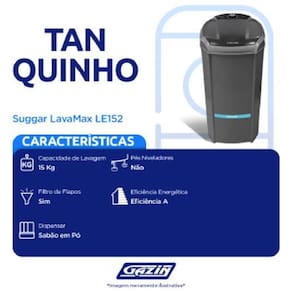 Lav 15kg suggar lavamax eco Descrição Potência: 500w Capacidade: 15 kg Dispenser para sabão: sim Níveis de água: 3 níveis Filtro cata-fiapos: sim Timer: sim Desligamento automático: sim Quantidade de molhos: 3 molhos Consumo baixo: : 0,10kwh/ciclo Inmetro: a . Dimensões do produto Altura: 96,1 cm Largura: 49,8 cm Profundidade: 54 cm Peso: 10,19 kg . Dimensões da embalagem Altura: 96,7 cm Largura: 50,4 cm Profundidade: 54,6 Peso: 11,54 kg Marca: Não Informado Ean: 7908312818296