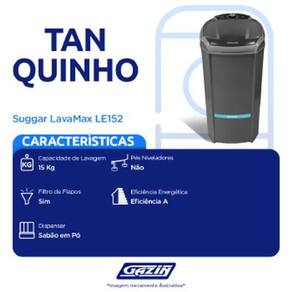 Lav 15kg suggar lavamax eco Descrição Potência: 500w Capacidade: 15 kg Dispenser para sabão: sim Níveis de água: 3 níveis Filtro cata-fiapos: sim Timer: sim Desligamento automático: sim Quantidade de molhos: 3 molhos Consumo baixo: : 0,10kwh/ciclo Inmetro: a . Dimensões do produto Altura: 96,1 cm Largura: 49,8 cm Profundidade: 54 cm Peso: 10,19 kg . Dimensões da embalagem Altura: 96,7 cm Largura: 50,4 cm Profundidade: 54,6 Peso: 11,54 kg Marca: Não Informado