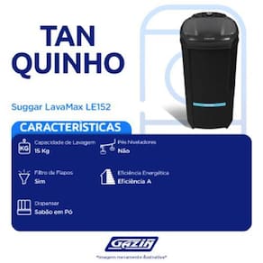 Lav 15kg suggar lavamax eco Descrição Potência: 500w Capacidade: 15 kg Dispenser para sabão: sim Níveis de água: 3 níveis Filtro cata-fiapos: sim Timer: sim Desligamento automático: sim Quantidade de molhos: 3 molhos Consumo baixo: : 0,10kwh/ciclo Inmetro: a . Dimensões do produto Altura: 96,1 cm Largura: 49,8 cm Profundidade: 54 cm Peso: 10,19 kg . Dimensões da embalagem Altura: 96,7 cm Largura: 50,4 cm Profundidade: 54,6 Peso: 11,54 kg Marca: Não Informado