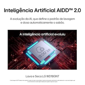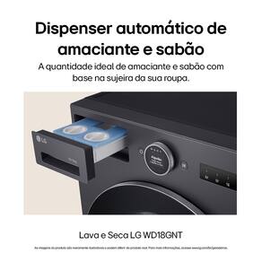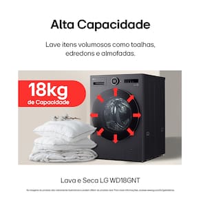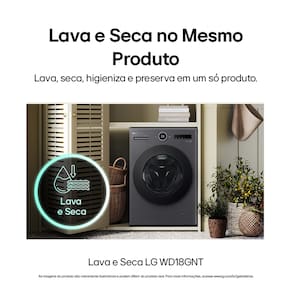 - Lava e Seca LG WD18GNTS6 - Tipo: Lava e seca frontal - Abertura: Frontal - Capacidade de lavagem: 18kg - Capacidade de secagem: 10kg - Tecnologia: AI DD - Função vapor: Sim (Steam) - Sistema de lavagem: TurboWash 360° - Conectividade: Wi-Fi (LG ThinQ) - Motor: Inverter Direct Drive - Dimensões (AxLxP): 95 x 65 x 78 cm - Cor: Black InoxCentrifugação