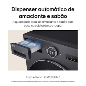 - Lava e Seca LG WD18GNTS6 - Tipo: Lava e seca frontal - Abertura: Frontal - Capacidade de lavagem: 18kg - Capacidade de secagem: 10kg - Tecnologia: AI DD - Função vapor: Sim (Steam) - Sistema de lavagem: TurboWash 360° - Conectividade: Wi-Fi (LG ThinQ) - Motor: Inverter Direct Drive - Dimensões (AxLxP): 95 x 65 x 78 cm - Cor: Black InoxCentrifugação