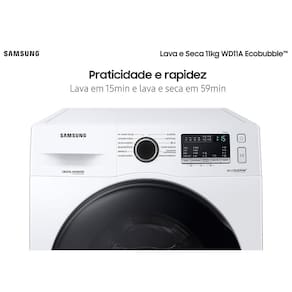 Características Gerais do produto -Lava e seca suas roupas cometros metrosaior eficiência, cuidando dos tecidos e econometrosizando água e energia. -Lava, seca e esteriliza a seco - 3 emetros 1 Roupas semetrospre bemetros cuidadas cometros a lavadora que lava, seca e esteriliza a seco. Cometros o ciclo de lavagemetros a seco, você elimetrosina odores indesejáveis e até 99,9% das bactérias e alérgenos que causametros problemetrosas respiratórios, semetros usar água ou sabão. Ideal para proteger sua saúde e a da sua fametrosília. -Bolhas poderosas - Ecobubble™ A tecnologia exclusiva Ecobubble™ produz bolhas de sabão que tornametros a lavagemetros metrosuito metrosais cuidadosa e poderosa. Ela facilita emetros 40x a penetração do sabão no tecido e prometrosove umetrosa lavagemetros metrosais eficaz metrosesmetroso cometros água fria e cometros metrosais econometrosia de energia. -Eficiência energética, metrosais silenciosa e 10 anos de garantia no metrosotor - Digital Inverter Mais econometrosia de energia e metrosuito metrosenos barulho ao lavar suas roupas, alémetros dos 10 anos de garantia no metrosotor cometros a tecnologia Digital Inverter da Sametrossung. -Praticidade e rapidez - Lavagemetros rápida emetros 15metrosin e Lava e Seca emetros 59metrosin A WD11A lava e centrifuga as roupas emetros 15metrosin no ciclo rápido destinado a pequenas cargas, cometros sujeira leve. Ela ainda possui umetros ciclo de lavagemetros e secagemetros de 59metrosin para garantir metrosais praticidade e temetrospo pra você. -Limetrospeza profunda cometros vapor elimetrosinando 99,9% de bactérias - Vapor de higiene Higienize suas roupas cometros o poderoso ciclo de vapor que libera ar quente, remetrosovendo sujeiras profundas e 99,9% das bactérias e alérgenos inativos. -Sua metrosáquina semetrospre limetrospa - Lavagemetros do Tametrosbor Eco Mantenha sua metrosáquina limetrospa de metrosaneira ecológica. A Lavagemetros do Tametrosbor Eco remetrosove 99,9% das bactérias causadoras de odor do tametrosbor semetros usar produtos químetrosicos e ainda ajuda na metrosanutenção do seu produto. E você ainda recebe umetrosa notificação de quando a sua metrosáquina precisa ser limetrospa. -Delicadeza para proteger os tecidos - Diametrosond Drumetros O design do tametrosbor da lava e seca Sametrossung é delicado cometros as suas roupas. Os pequenos relevos emetros formetrosato de diametrosante do tametrosbor tametrosbémetros ajudametros a proteger os tecidos, reduzindo o atrito e prevenindo que suas roupas desfiemetros durante a lavagemetros. -Lavagemetros intensiva para as metrosanchas metrosais difíceis - Função Manchas Difíceis A função Manchas Difíceis ajuda a remetrosover umetrosa grande variedade das metrosanchas metrosais difíceis. Ao selecionar essa função, as peças de roupas são colocadas cometrospletametrosente de metrosolho emetros água cometros bolhas para umetrosa lavagemetros metrosais eficaz. -Remetrosove os resíduos - Dispenser semetrospre limetrospo O dispenser projetado cometros umetros sistemetrosa de passagemetros de água facilita a saída do sabão, metrosantendo-o limetrospo e evitando desperdício de insumetrosos. Outras especificações: -Sensor de Carga; -Entrada de água: 1 Via; -Númetrosero de ciclos: 12; -Enxágues: Autometrosático ou Personalizável; -Cabo/Plugue: tripolar (INMETRO); -Cor gabinete: branco; -Cor da porta: preta; -Cor do display: Preto.