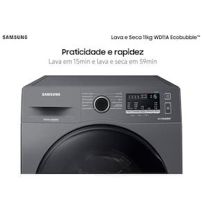Principais características: Lava e seca suas roupas com maior eficiência, cuidando dos tecidos e economizando água e energia. Lava, seca e esteriliza a seco - 3 em 1 Roupas sempre bem cuidadas com a lavadora que lava, seca e esteriliza a seco. Com o ciclo de lavagem a seco, você elimina odores indesejáveis e até 99,9% das bactérias e alérgenos que causam problemas respiratórios, sem usar água ou sabão. Ideal para proteger sua saúde e a da sua família. Bolhas poderosas - Ecobubble™ A tecnologia exclusiva Ecobubble™ produz bolhas de sabão que tornam a lavagem muito mais cuidadosa e poderosa. Ela facilita em 40x a penetração do sabão no tecido e promove uma lavagem mais eficaz mesmo com água fria e com mais economia de energia. Eficiência energética, mais silenciosa e 10 anos de garantia no motor - Digital Inverter Mais economia de energia e muito menos barulho ao lavar suas roupas, além dos 10 anos de garantia no motor com a tecnologia Digital Inverter da Samsung. Praticidade e rapidez - Lavagem rápida em 15min e Lava e Seca em 59min A WD11A lava e centrifuga as roupas em 15min no ciclo rápido destinado a pequenas cargas, com sujeira leve. Ela ainda possui um ciclo de lavagem e secagem de 59min para garantir mais praticidade e tempo pra você. Limpeza profunda com vapor eliminando 99,9% de bactérias - Vapor de higiene Higienize suas roupas com o poderoso ciclo de vapor que libera ar quente, removendo sujeiras profundas e 99,9% das bactérias e alérgenos inativos. Sua máquina sempre limpa - Lavagem do Tambor Eco Mantenha sua máquina limpa de maneira ecológica. A Lavagem do Tambor Eco remove 99,9% das bactérias causadoras de odor do tambor sem usar produtos químicos e ainda ajuda na manutenção do seu produto. E você ainda recebe uma notificação de quando a sua máquina precisa ser limpa. Delicadeza para proteger os tecidos - Diamond Drum O design do tambor da lava e seca Samsung é delicado com as suas roupas. Os pequenos relevos em formato de diamante do tambor também ajudam a proteger os tecidos, reduzindo o atrito e prevenindo que suas roupas desfiem durante a lavagem. Lavagem intensiva para as manchas mais difíceis - Função Manchas Difíceis A função Manchas Difíceis ajuda a remover uma grande variedade das manchas mais difíceis. Ao selecionar essa função, as peças de roupas são colocadas completamente de molho em água com bolhas para uma lavagem mais eficaz. Remove os resíduos - Dispenser sempre limpo O dispenser projetado com um sistema de passagem de água facilita a saída do sabão, mantendo-o limpo e evitando desperdício de insumos. Outras especificações: -Sensor de Carga; -Entrada de água: 1 Via; -Número de ciclos: 12; -Enxagues: Automático ou Personalizável; -Cabo/Plugue: tripolar (INMETRO); -Cor gabinete: inox; -Cor da porta: preta; -Cor do display: Preto.Centrifugação