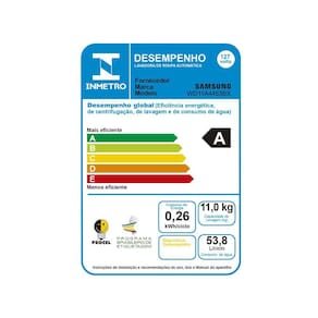 N°1 em economia de água 3 em 1: lava, seca e esteriliza a secoEcobubble™: eficiência de lavagem e cuidado com as roupas As novas lava e seca Samsung consomem menos água por ciclo quando comparadas com outros modelos disponíveis no mercado, segundo testes de consumo e eficiência energética. Economia para você e menos impacto no planeta. Roupas sempre bem cuidadas com a lavadora que lava, seca e esteriliza a seco. Com o ciclo de lavagem a seco, você elimina odores indesejáveis e até 99,9% das bactérias e alérgenos que causam problemas respiratórios, sem usar água ou sabão. Ideal para proteger sua saúde e a da sua família. A tecnologia exclusiva Ecobubble™ produz bolhas de sabão que tornam a lavagem muito mais cuidadosa e poderosa. Ela facilita em 40x a penetração do sabão no tecido e promove uma lavagem mais eficaz mesmo com água fria e com mais economia de energia. Mais economia de energia e muito menos barulho ao lavar suas roupas, além dos 10 anos de garantia no motor com a tecnologia Digital Inverter da Samsung. A WD11A lava e centrifuga as roupas em 15min no ciclo rápido destinado a pequenas cargas, com sujeira leve. Ela ainda possui um ciclo de lavagem e secagem de 59min para garantir mais praticidade e tempo pra você. Higienize suas roupas com o poderoso ciclo de vapor que libera ar quente, removendo sujeiras profundas e 99,9% das bactérias e alérgenos inativos. Mantenha sua máquina limpa de maneira ecológica. A Lavagem do Tambor Eco remove 99,9% das bactérias causadoras de odor do tambor sem usar produtos químicos e ainda ajuda na manutenção do seu produto. E você ainda recebe uma notificação de quando a sua máquina precisa ser limpa. O design do tambor da lava e seca Samsung é delicado com as suas roupas. Os pequenos relevos em formato de diamante do tambor também ajudam a proteger os tecidos, reduzindo o atrito e prevenindo que suas roupas desfiem durante a lavagem. A função Manchas Difíceis ajuda a remover uma grande variedade das manchas mais difíceis. Ao selecionar essa função, as peças de roupas são colocadas completamente de molho em água com bolhas para uma lavagem mais eficaz. O dispenser projetado com um sistema de passagem de água facilita a saída do sabão, mantendo-o limpo e evitando desperdício de insumos.