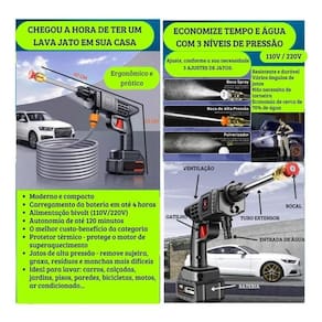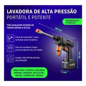 Descrição do produto este produto será enviado com duas baterias de 96v, uma maleta e o kit completo de acessórios, para usar na lavadora Lavadora portátil de segunda geração, movida à bateria recarregável Apresentamos a lavadora de alta pressão portátil, com 2 baterias de 96v recarregáveis. Transforme a sua experiência, com esta lavadora. Ideal para você, que precisa realizar tarefas de limpeza de forma rápida, prática e econômica, este produto oferece qualidade e eficiência que você pode confiar. A lavadora de alta pressão portátil é uma excelente escolha para quem busca praticidade e eficiência nas tarefas de limpeza. Por ser movida à bateria recarregável, ela oferece mobilidade e facilidade de uso, permitindo que você a utilize em diferentes locais sem a necessidade de uma fonte de energia fixa. Além disso, seu design ergonômico e moderno torna o manuseio mais confortável. É uma ferramenta versátil e indispensável, que pode ser utilizada em diversas situações, como na limpeza de carros, calçadas, móveis de jardim e muito mais. Não fique sem bateria na execução dos serviços do dia a dia. Recuse promessas falsas de baterias com amperagem e voltagem acima do que realmente são. As nossas lavadoras e baterias são de ótima qualidade e seguem os valores dentro dos padrões reais. Atenção ao primeiro uso da lavadora. Recomendamos que você inicie o uso conectando o produto diretamente à torneira, a fim de expelir o ar do sistema. Após essa etapa, você poderá utilizá-lo normalmente em qualquer balde. Lembre-se de que é essencial realizar uma carga inicial completa de 6 horas antes de utilizar o produto. Após apertar o gatilho por alguns segundos, os primeiros jatos começarão a sair imediatamente. Bateria de última geração Equipada com tecnologia de bateria de lítio, a nossa lavadora irá superar as suas expectativas. Versatilidade inigualável A solução que você sempre buscou finalmente está aqui. Conheça a lavadora portátil perfeita para as suas tarefas de limpeza. Design ergonômico e portabilidade Com um design ergonômico e uma aderência confortável, nossa lavadora oferece uma experiência de uso sem igual. Além disso, é leve e portátil, ideal para acompanhar você em qualquer lugar. Ficha técnica: - dimensão: 24x24x14cm - bateria lítio - potência: 1.000w - pressão: 32 bar - material plástico abs + componentes elétricos de metal - tensão do carregador: 110v/220v - tempo de carga: até 3 horas - tempo de uso: até 2 horas - bocal de alta pressão - funcionalidade: 3 tipos - níveis : desde lavar carros a regar plantas multiuso - consumo: 4 litros de água / minuto Cuidados e recomendações: Este produto é portátil, portanto, sua potência pode variar em comparação aos modelos conectados à rede elétrica. Recomendamos considerar este fato antes da compra. Não ligue a unidade sem água. Evite quedas. Não desmonte o produto. Itens inclusos: 1x lavadora 1x maleta 2x bateria de 96v 1x ponteira de metal 1x mangueira de 5 metros 2x bicos 1x adaptador para mangueira de jardim 1x conector de engate rápido 1x carregador de bateria 1x filtro 1x recipiente para sabão de 300ml Não perca a chance de transformar sua experiência de limpeza. Adquira sua lavadora de alta performance hoje mesmo e descubra o verdadeiro poder de uma limpeza sem limites.
