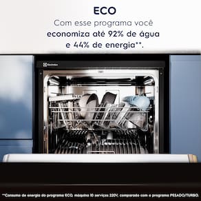 9 litros por ciclo, enquanto a lavagem tradicional pode chegar a 117 litros. Esta lava-louças também economiza até 44% de energia.
