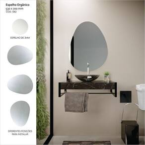 Este conjunto une modernidade e elegância em cada detalhe. O tampo em porcelanato polido garante um design sofisticado e acabamento impecável, enquanto a cuba de apoio em vidro moldado adiciona um charme único ao ambiente. Com porta-toalha integrado, tubos estruturais em alumínio com pintura eletrostática, a peça oferece não apenas durabilidade e resistência, mas também um visual contemporâneo que valoriza seu espaço. Para completar, a válvula cromada exclusiva traz praticidade no uso e um toque extra de brilho com espelho orgânico Lapidado de 3mm une qualidade e resistência superiores, proporcionando um reflexo nítido e duradouro. Com design moderno e formato orgânico, ele valoriza qualquer ambiente, adicionando sofisticação. Altura do Conjunto: 70 cm Ambiente: null Ambiente Principal: Banheiro Cor: PRETO/VIDRO FUME Garantia do Fornecedor: 12 meses Informação Complementar: 1x Espelho Decorativo Orgânico 53cm x 70cm Cromado Largura: 53 cm Altura: 70 cm Peso: 2,91 kg Profundidade: 0,3 cm Necessita Montagem: Sim