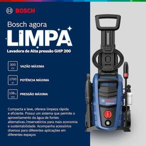 Com um design robusto e moderno, a Lavadora de Alta Pressao Bosch GHP 200 se destaca pela sua compactacao e facilidade de transporte. Sua estrutura foi pensada para otimizar o armazenamento e a movimentacao, garantindo praticidade no dia a dia, sem abrir mao da durabilidade e da eficiencia que a marca Bosch oferece.