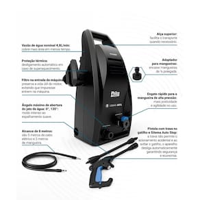 • Potência nominal do motor 1600W • Pressão Nominal (PSI) 1200 PSI • Pressão Máxima (PSI) 1800 PSI • Pressão de entrada de água necessária 1MPa • Vazão de água nominal (l) 4,8L • Vazão de água máxima (l) 6,8L • Alcance total durante o uso (5m de cabo elétrico e 3m de mangueira = 8 metros) • Engate rápido para a mangueira • Gatilho com sistema auto stop • Ajuste de Spray/ Jato • Suporte para todos os acessórios • Ângulo de jato de água com ajuste de abertura de até Variação de 0 a 135° • Filtro na entrada da máquina • Alça para transporte • Adaptador para mangueira de 1/2 • Comprimento da mangueira de alta pressão (3m) • Protetor térmico (desliga o aparelho em casos de sobreaquecimento) • Economia de Água superior (85%)