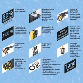 Informações Gerais : Motor de indução robusto de alto desempenho. Moderno sistema de Stop Total, que desliga o motor e alivia a pressão interna através da liberação do gatilho, gerando economia de energia e água.Permite a regulagem do leque de água de acordo com o trabalho a ser realizado e ponteira turbo para os trabalhos mais pesados.Ideal para limpeza frequentes, (sítios, casas de campo, trabalhos sem fins lucrativos). Prolongador da pistola proporciona maior facilidade e ergonomia para limpezas em locais altos ou baixos.Engates rápidos para as mangueiras e acessórios, garantem mais agilidade na hora da montagem e desmontagem do equipamento.Conector de entrada de água com filtro interno lavável, que impede a entrada de sujeira de mangueiras ou canos na lavadora.Filtro para sucção de água, permitindo utilizar água de uma cisterna ou caixa dágua. Diferença de nível dágua máximo: 0,5 m. Comprimento de mangueira máx 7,5 m.Dispositivo contra superaquecimento do motor proporciona maior vida útil do equipamento.Leve e compacta, possui suporte para os acessórios proporcionando mais organização para armazenar o equipamento.Equipada com rodas de 210 mm e alça ergonômica que facilitam o transporte e garantem total mobilidade.Possui dispositivo interno para aplicação de sabão que facilita os trabalhos de limpeza. Utilize somente detergente líquido e neutro. Não utilizar cloro, hipoclorito, sabão em pó e similares.Acompanha: pistola de alta pressão com trava, ponteira turbo, ponteira para regular o jato de saída de água, mangueira de alta pressão, filtro para sucção de água, dispositivo interno para aplicação de sabão, engate rápido e manual de instruções.Produto certificado através da portaria 371/2009 do Inmetro, conforme normas IEC 60335-1 e IEC60335-2-79 para segurança de aparelhos eletrodomésticos e similares. (Segurança - Compulsório - UL-BR - OCP - 0029).