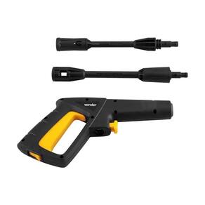 1 Lavadora de alta pressão, 1 acessório para detergente, 1 mangueira de alta pressão com 5 m, 1 lança com bico ajustável, 1 pistola com gatilho e 1 conector engate rápido de 1/2" com filtro interno lavável.