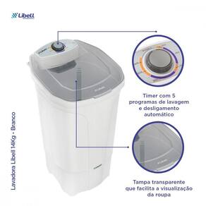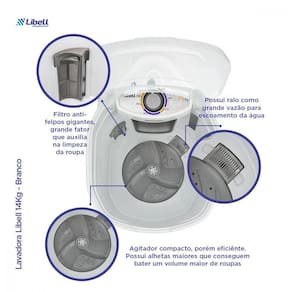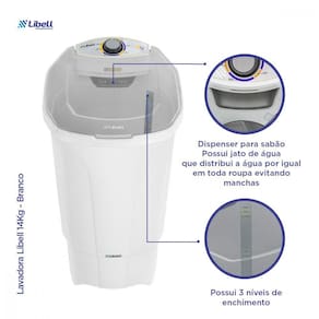 A Lavadora de Roupas Libell 14kg e ideal para familias que buscam praticidade e eficiencia. Com capacidade para 14kg e voltagem de 110V, lava grandes volumes com rapidez e economia de agua. Seu design compacto e moderno na cor branca se adapta a qualquer lavanderia. Robusta, facil de usar e perfeita para o dia a dia.