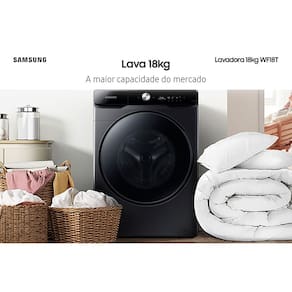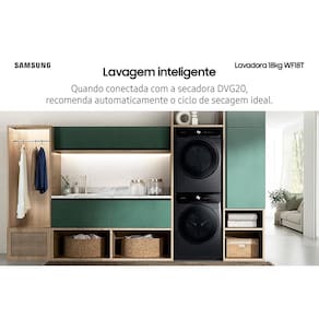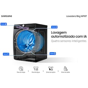 A Lavadora de Roupas Samsung WF18T é uma excelente opção para quem prioriza tecnologia e inovação no cuidado com as roupas. Essa máquina de lavar inteligente e conectada identifica os hábitos de lavagem da sua família e recomenda os seus ciclos favoritos. Ela ainda exibe durante a lavagem as informações mais importantes. A lavagem com IA utiliza 4 sensores inteligentes que identificam automaticamente a carga de roupas e calculam a quantidade ideal de água e sabão. Um sensor monitora o nível de sujeira na água para otimizar a lavagem: se as roupas estão mais sujas, a máquina aumenta o tempo de lavagem e quantidade de sabão; se estiverem pouco sujas, a lavadora reduz o tempo de lavagem. Sua tecnologia exclusiva Ecobubble produz bolhas de sabão que tornam a lavagem muito mais cuidadosa e poderosa. Ela facilita em 40x a penetração do sabão no tecido e promove uma lavagem mais eficaz mesmo com água fria e com mais economia de energia. Com a WF18T você terá mais economia de energia e muito menos barulho ao lavar suas roupas, além dos 20 anos de garantia no motor com a tecnologia Digital Inverter da Samsung.