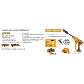 Lavadora de alta pressão ingco à bateria íon-lítio 20v Referencia: cpwli20362-9 Características: Tensão: 20v Pressão máxima: 24,8 bar 360 psi Taxa de fluxo: 2,8l / min Sistema de parada automática 1 bateria 2.0ah 1 carregador de baterias bivolt: 1h 2.0ah ou 2h 4.0ah bivolt 1 conjunto de Ferramenta de aplicação de pulverização de 6 padrões 1 mangueira de entrada de água de 6 m com conector rápido 1 conector de auto-sucção 1 aplicador de detergente e 300ml 1 bolsa portátil Embalado em caixa de papelão Marca: Não Informado