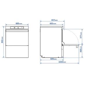 Características Técnicas: Construída em aço inoxidável Cada gaveta acomoda até 18 pratos ou 9 bandejas de até 46cm de comprimento Possui programação intuitiva e conta com três opções de ciclos de lavagem, sendo o menor de apenas um minuto Realiza as lavagens a quente, o que elimina a maioria dos micro-organismos presentes nas louças Possível lavar até 18 pratos de uma só vez Displays de LED que indicam as temperaturas de lavagem e enxágue Painel de comando eletrônico posicionado na parte superior frontal do equipamento Abertura da porta frontal com ampla altura útil de 38cm Braços de lavagem e de enxágue independentes e confeccionados em aço inoxidável Tanque de lavagem de 20 litros de água Possui pranchas coletoras de resíduos posicionadas na parte superior do tanque Paredes internas com cantos arredondados que evitam o acúmulo de resíduos e facilitam a higienização do equipamento Porta com parede dupla para melhor isolamento térmico e acústico Aquecedor de enxágue incorporado com capacidade para 7 litros de água Consumo: 2,4 litros de água por ciclo Temperatura de lavagem: 55 a 65C Temperatura de enxágue: 80 a 90C Potência: 5,7 kW Consumo: 3,3 kW/h Certificada pela Portaria INMETRO N371