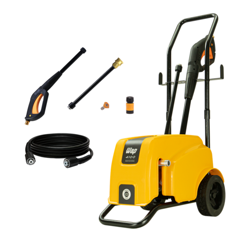 Seja Bem Vindo a DD Máquinas!A lavadora de alta pressão WAP 4100 é a melhor opção para limpar sujeiras pesadas e profundas de grandes áreas com rapidez e agilidade. Com motor de indução, vazão máxima de até 500 L/h, potência de até 2200W e pressão máxima de até 2000 PSI, é o equipamento de uso frequente perfeito para a remoção de níveis incrustados de sujeira nos mais diversos tipos de pisos e superfícies. É uma máquina compacta, durável, robusta e super prática para transportar. Ela cabe, inclusive, na caixa de transporte de motocicletas. Possui um exclusivo porta-acessórios que ajuda na organização dos componentes do produto e rodas emborrachadas, antiderrapantes, que não riscam o piso e facilitam o transporte.A lavadora de alta pressão WAP 4100 é uma excelente máquina para ser usada em pequenos negócios como lava car, mercadinhos, restaurantes, frutarias, açougues e também em condomínios.Características:Tensão: 127v Cor: Amarelo Com PretoPotência Elétrica: 1500w (127v)Pressão Máxima: 1650 Psi (127v) Vazão: 420 L/h (127v) Motor: InduçãoClasse De Isolação: IFrequência: 60 HzCabo Elétrico: 5 MMangueira: 7,5 MPeso Líquido: 15,3 KgPeso Bruto: 18 KgCertificado Inmetro: Hous 0267/c 0799.16Cubagem: 0,0679 M³Empilhamento Máximo: 3Dimensões Do Produto (Cxlxa): 43 X 32 X 84 CmDimensões Da Embalagem (Cxlxa): 47,6 X 32,8 X 43,5 CmAcessórios:1 Caneca de alta pressão com trava de segurança.1 Lança com engate rápido.1 Bico leque 15°.1 Mangueira de alta pressão com 7,5 metros.1 Engate rápido.1 Agulha de limpeza para bico.Componentes:Bomba axial com cabeçote de alumínio.Pistões em aço inox.Cabo elétrico de 5 metros.Suporte para acessórios.2 Rodas de borracha para transporte.Alça removível para transporte.Sistema Stop Total.*Imagens Meramente Ilustrativas.Todas as Informações divulgadas são de responsabilidade do Fabricante/Fornecedor.Tome cuidado ao manusear e utilizar o aparelho.