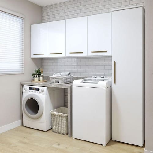 Quais sao os melhores armarios para lavanderia pequena? Os melhores modelos sao armarios com prateleiras que otimizam espaco e ajudam a organizar produtos e utensilios de forma pratica.