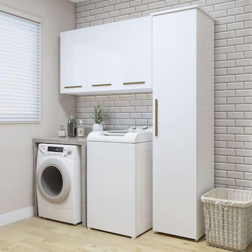 Quais sao os melhores armarios para lavanderia pequena? Os melhores modelos sao armarios com prateleiras que otimizam espaco e ajudam a organizar produtos e utensilios de forma pratica.