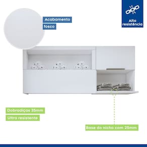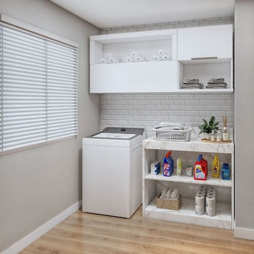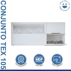 Transforme sua lavanderia em um ambiente funcional e elegante com o nosso conjunto de armários aéreos. As portas basculantes, são ideais para manter tudo organizado e ao alcance da mão, facilitando e ajudando na correria do dia a dia. Além de serem espaçosos, um dos armários possui um nicho que é o verdadeiro protagonista: perfeito para exibir suas decorações, plantinhas ou guardar aqueles obejetos que você ama. O design clean do conjunto combina perfeitamente com qualquer tipo de decoração. Acabamento da Porta: Pintura Acabamento da Prateleira: Pintura Acompanha Manual de Instalação: Sim Ambiente Principal: Área de Serviço codigo_ean: 7909903948637 Complexidade da Montagem: Média: pode ser montado por mais de uma pessoa e/ou necessite de maior conhecimento para montagem Cor: Branco Cor do Produto: Branco Cor Flex: Não possui Cor Interna: Branco Fosco Escala de Brilho: Semi-Fosco Escala de Brilho da Porta: Semi-Fosco Escala de Brilho da Prateleira: Semi-Fosco Fita Integrada: Não Formato do Espelho: Não Informações Complementares: Armario aéreo com nicho Itens Inclusos: 2 armários aéreos; Kit Ferragens e Manual de Montagem Linha ou Coleção: Tex Manual de Montagem e Instalação: https://product-hub-prd.madeiramadeira.com.br/952291/documents/03535e50-1a6e-48c6-b738-a8fd56f86e682391735554117273794130444.pdf Material da Porta: MDP Material da Prateleira: MDP Material do Fundo: MDP Material do Puxador: Alumínio Material do Puxador da Porta: MDP Material Principal: MDP Montagem Flex: Não Necessita Montagem: Sim O Módulo Pode ser utilizado individualmente: Sim Origem do Produto: Nacional Pés Removíveis: Não Peso: 41,5 kg Peso Máximo por Prateleira: 10 kg Porta com Fechadura: Não Possui Cabideiros: Não Possui Chave: Não Possui Espelho: Não Possui Nichos: 02 Possui Pés: Não Possui Tábua: Não Possui Vidro: Não Prateleiras Removíveis: Não Quantidade de Prateleiras: 02 Prateleiras Recomendações de Uso, Manutenção e Limpeza: Limpar com flanela limpa e seca. Não usar produtos abrasivos. Resistente à Chuva: Não Sapatas Niveladoras: Não Sistema de Montagem: Parafusos, Cavilhas Suporta Até (kg): 40 kg Tipo de Dobradiça/Corrediça da Porta: Metálica Tipo de Porta: Basculante Tipo de Puxador da Porta: Externo