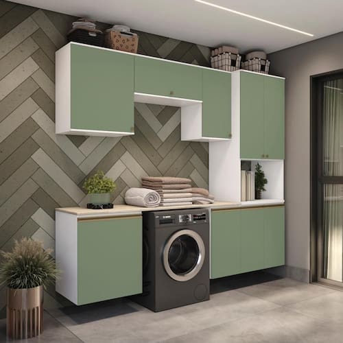 Para quem não abre mão de uma lavanderia espaçosa, funcional e com toda a qualidade do 100% MDF, vai se apaixonar pelo combo CB1291 da Celeste da Kappesberg. Com seis módulos, esse conjunto é perfeito para espaços amplos e abertos, proporcionando organização e facilidade nas tarefas da casa, desde a limpeza até o cuidado com as roupas. Os módulos, com amplo espaço interno, são perfeitos para organizar toalhas, cestos, produtos de limpeza e demais itens. E para materiais utilizados com maior frequência, o nicho aberto é a opção perfeita. Com até sete camadas de pintura, a caixaria é na cor branco brilho, enquanto as frentes são em verde oliva, com acabamento fosco. A combinação perfeita para quem gosta de ambientes tranquilos e charmosos, tranformando seu espaço com estilo e elegância, além de garantir mais praticidade na limpeza. E para um acabamento perfeito, o combo possui rodapés, mas acompanha as ferragens para ser montado suspenso na parede. Outra opção, é adquirir os pés separadamente. E para um projeto ainda mais completo, as portas possuem amortecimento, proporcionando um fechamento suave, sem ruído e mais durabilidade. Os puxadores, metálicos e dourados, com modelos diferentes nos balcões e aéreos, completam a beleza e diferencial do produto.